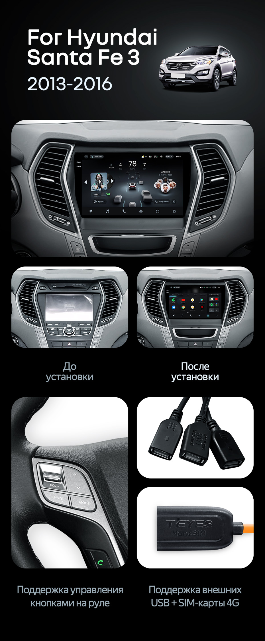 Штатная магнитола Teyes CC4 6/64 Hyundai Santa Fe 3 (2013-2016) Тип-B - купить всего за 44 220 руб. в интернет-магазине в Энгельсе Teyes.com.ru. ✓ Самый лучший выбор мультимедиа ✓ Лучшая замена штатному ГУ ✓ Тел. +7 (800) 775-31-74