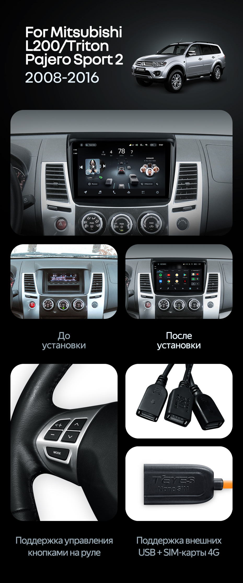 Штатная магнитола Teyes CC4 Pro 12/256 Mitsubishi L200 (2008-2016) - купить всего за 68 350 руб. в интернет-магазине в Энгельсе Teyes.com.ru. ✓ Самый лучший выбор мультимедиа ✓ Лучшая замена штатному ГУ ✓ Тел. +7 (800) 775-31-74