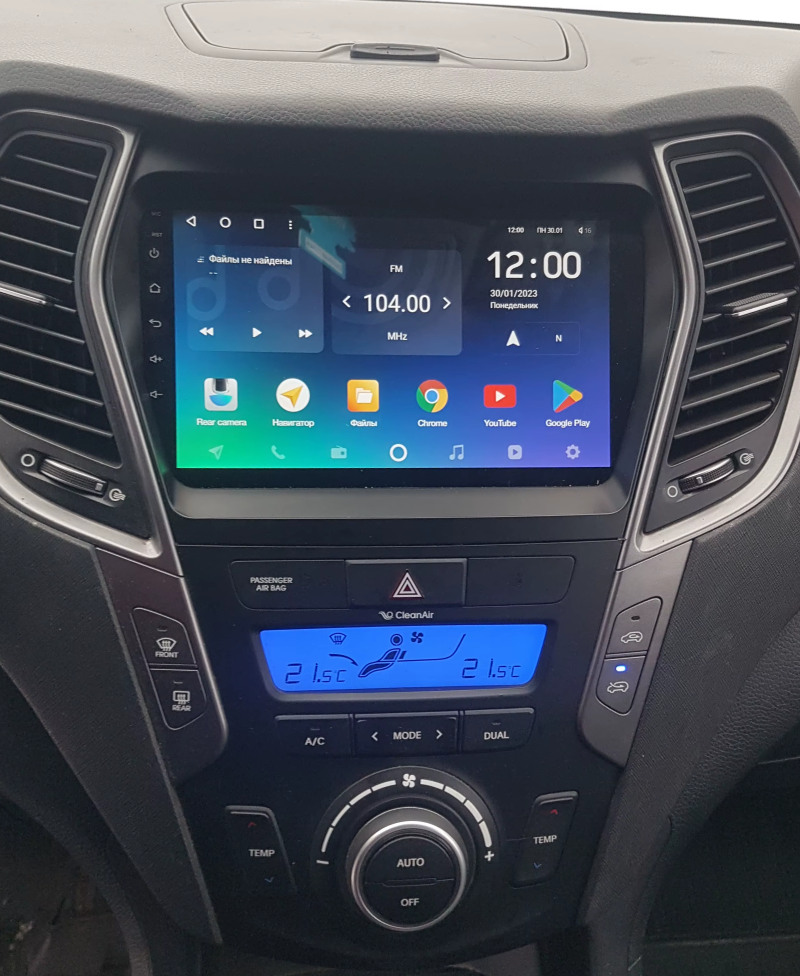 Установочный комплект для Hyundai Santa Fe 3 (2013-2016) включает переходную рамку и проводку.