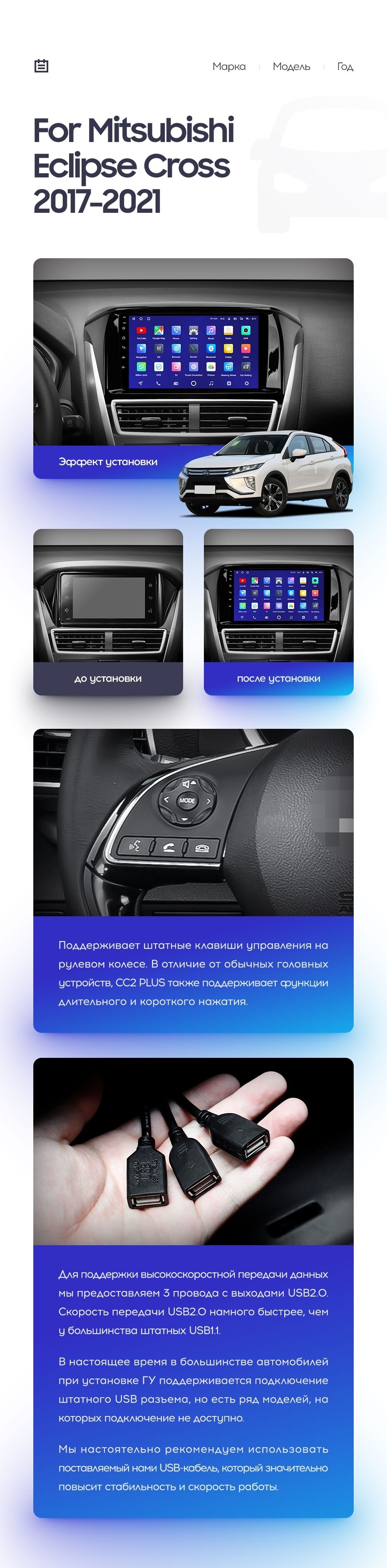 Полный комплект установки магнитолы Teyes с рамкой и проводкой можно выбрать в каталоге штатных магнитол Mitsubishi Eclipse Cross 1 (2017-2021).