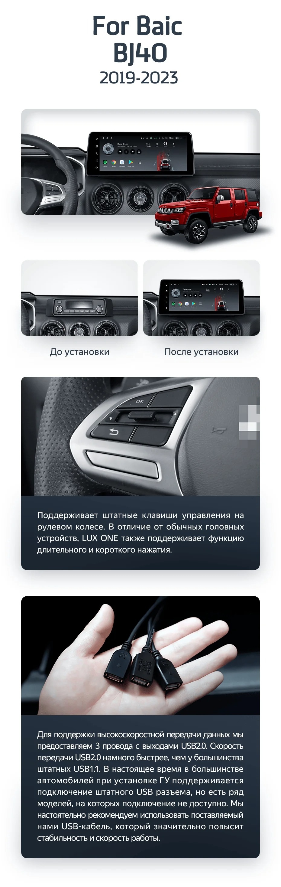 Полный комплект установки магнитолы Teyes с рамкой и проводкой можно выбрать в каталоге штатных магнитол Baic BJ40 (2019-2023).